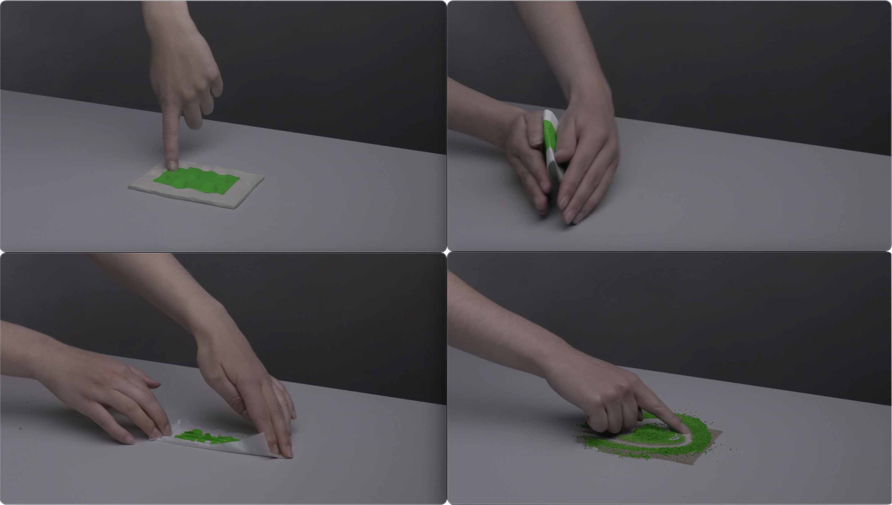 In the video installation, four physical materials are being tested by examining four different movements based on the movements we make while working on the computer. This is with the intention to refind material satisfaction.