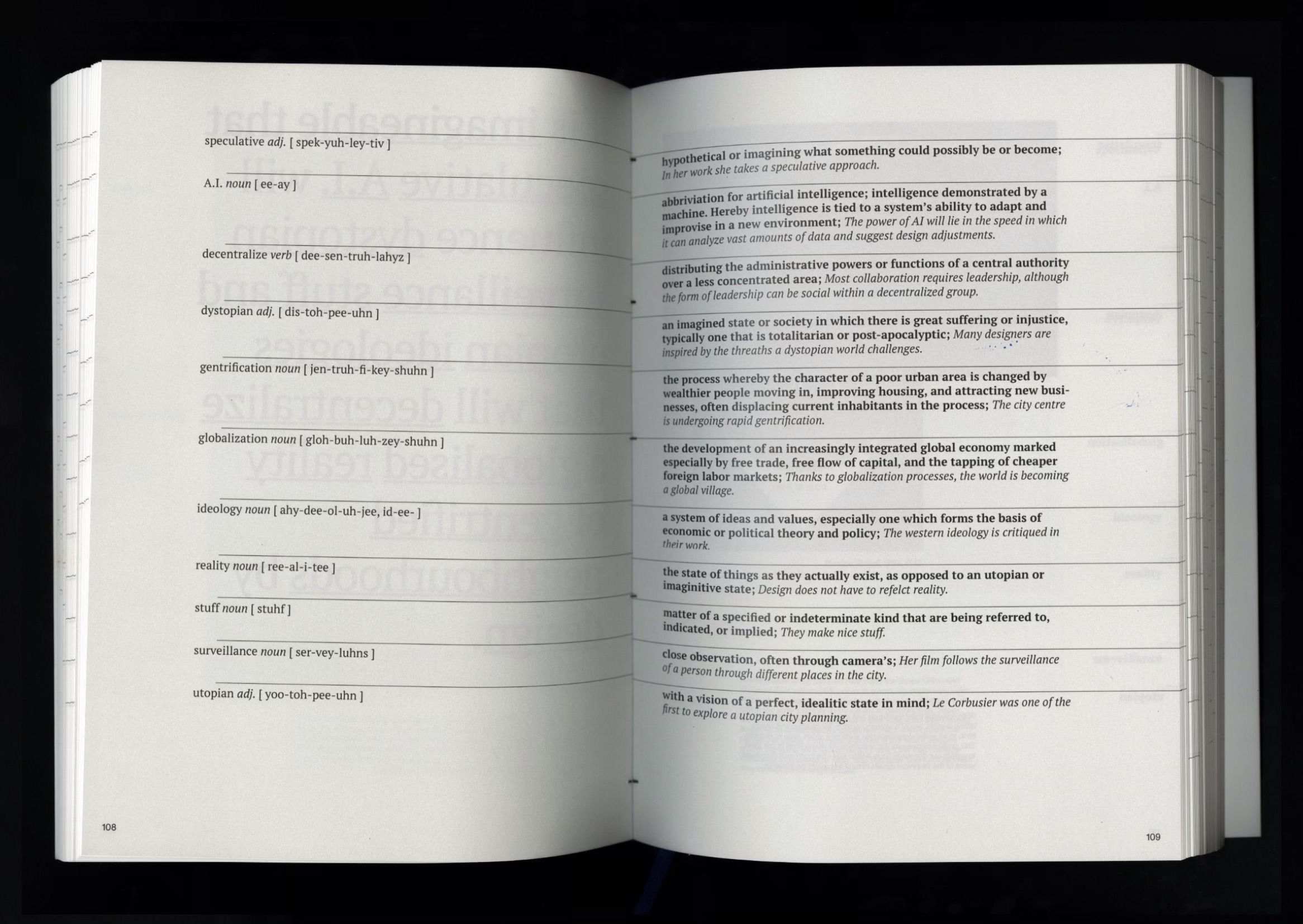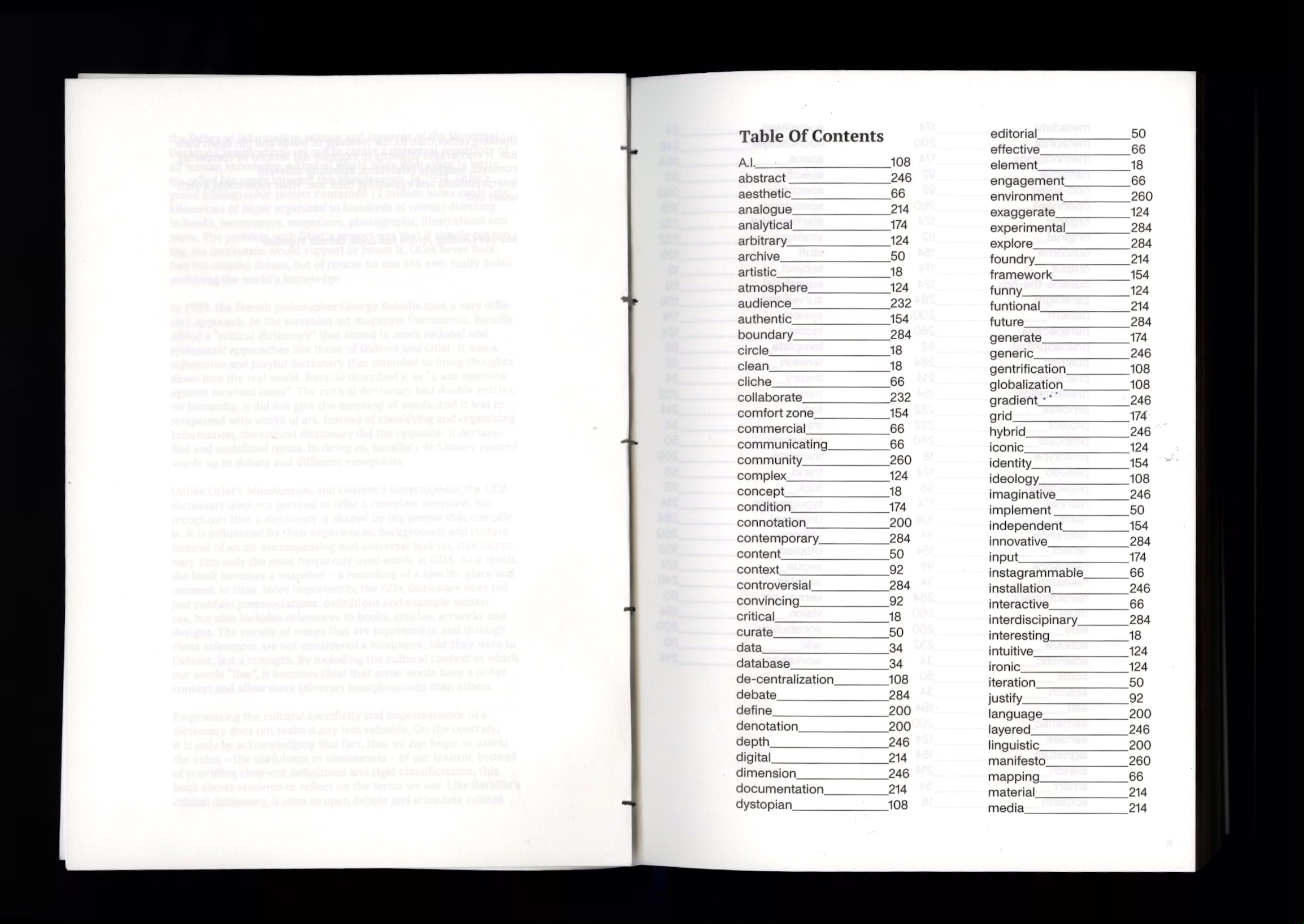 We collected, wrote, designed, and produced the first edition of the GDA lexicon. In this 300 page book, we gathered 166 of the most used terms in our graphic design department. To show how versatile these words and defnitions are, we included more than 200 sources of artworks and essays that strengthened and explained these terms further. In this book, we see language within design as fluid and ever-changing. We wanted to be critical of the use of certain words, as we tend to sometimes overuse them or place them in descriptions that make works of design more ‘interesting’.
