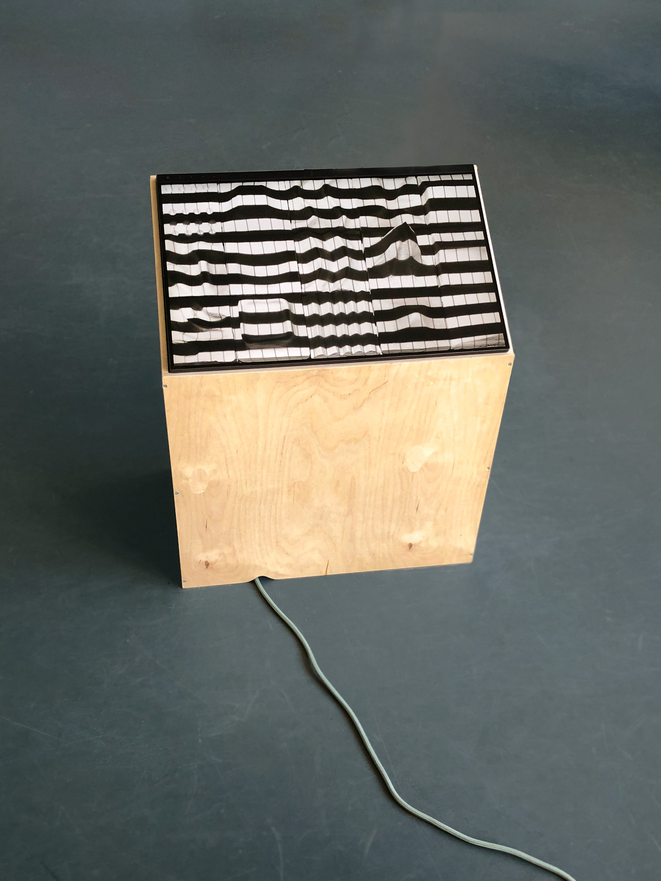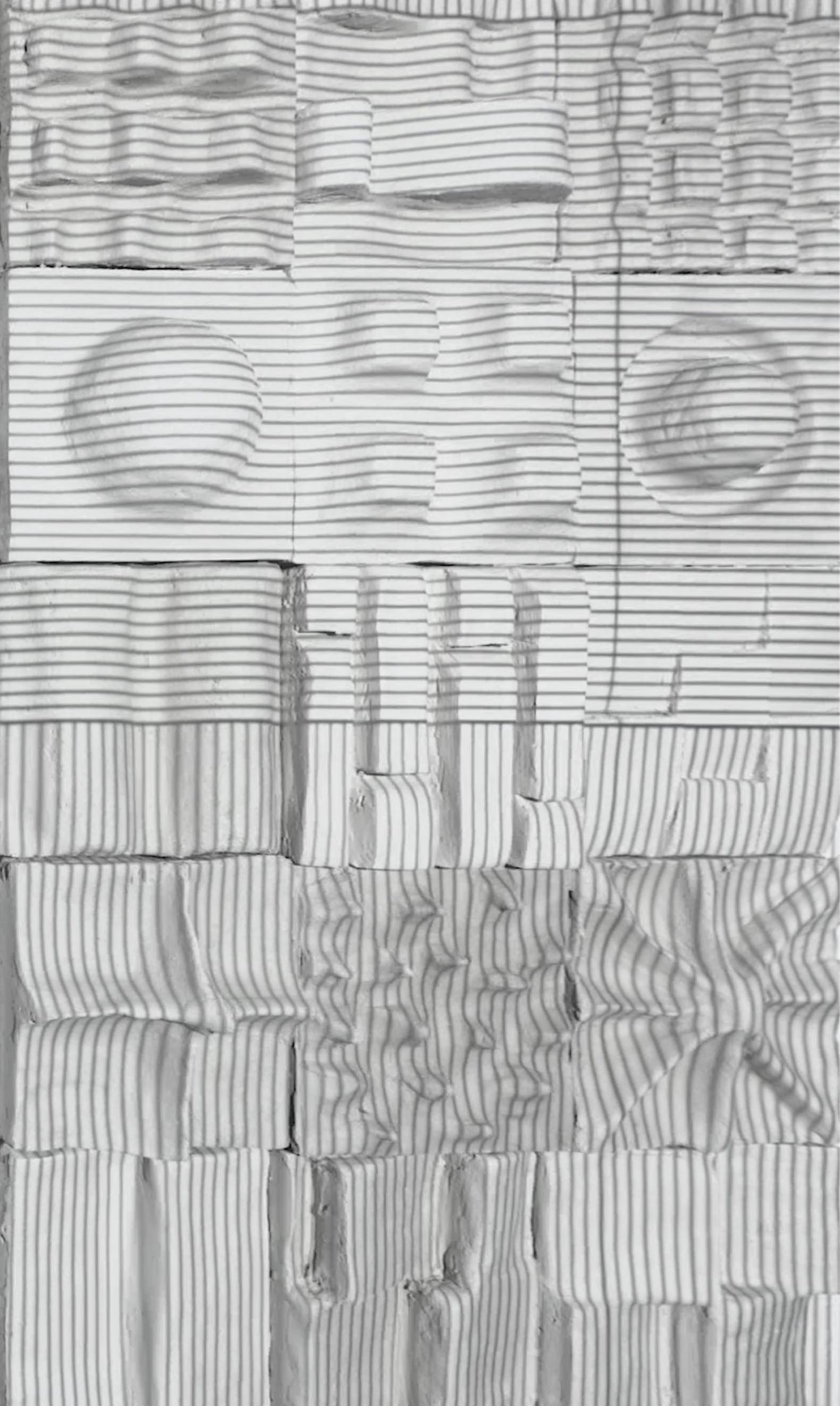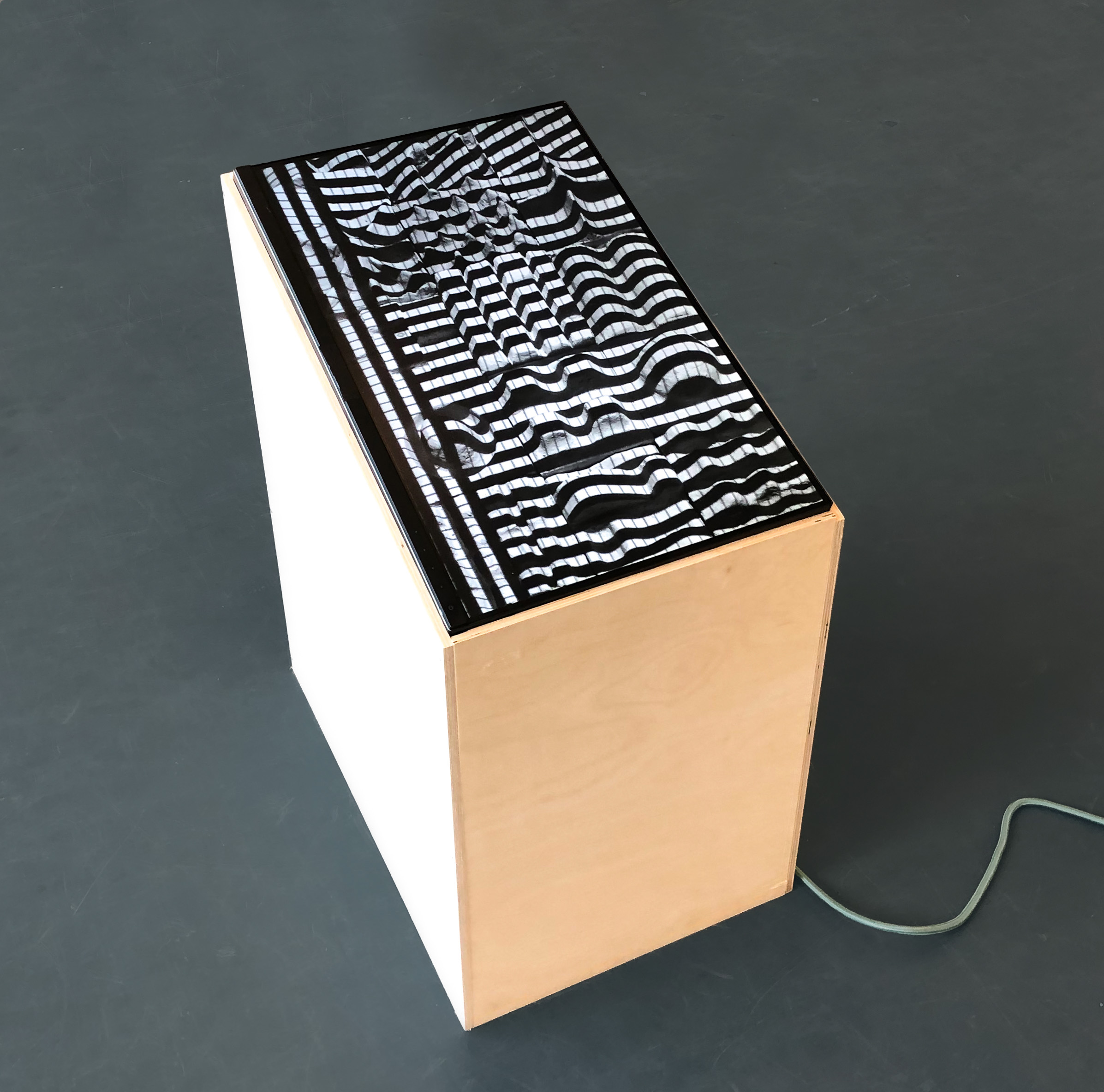By projecting the vector lines and manipulating them by handmade textured surfaces, the lines start scaling, bending and rotating again. They get a material context in physical space(Z), time, and in process.