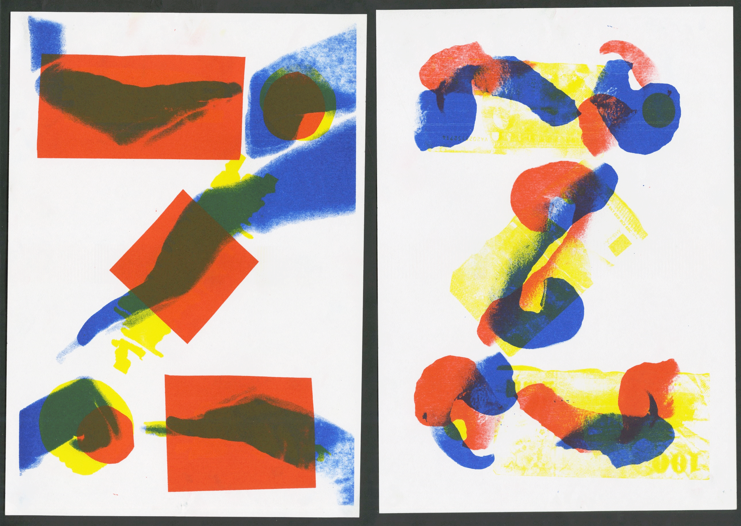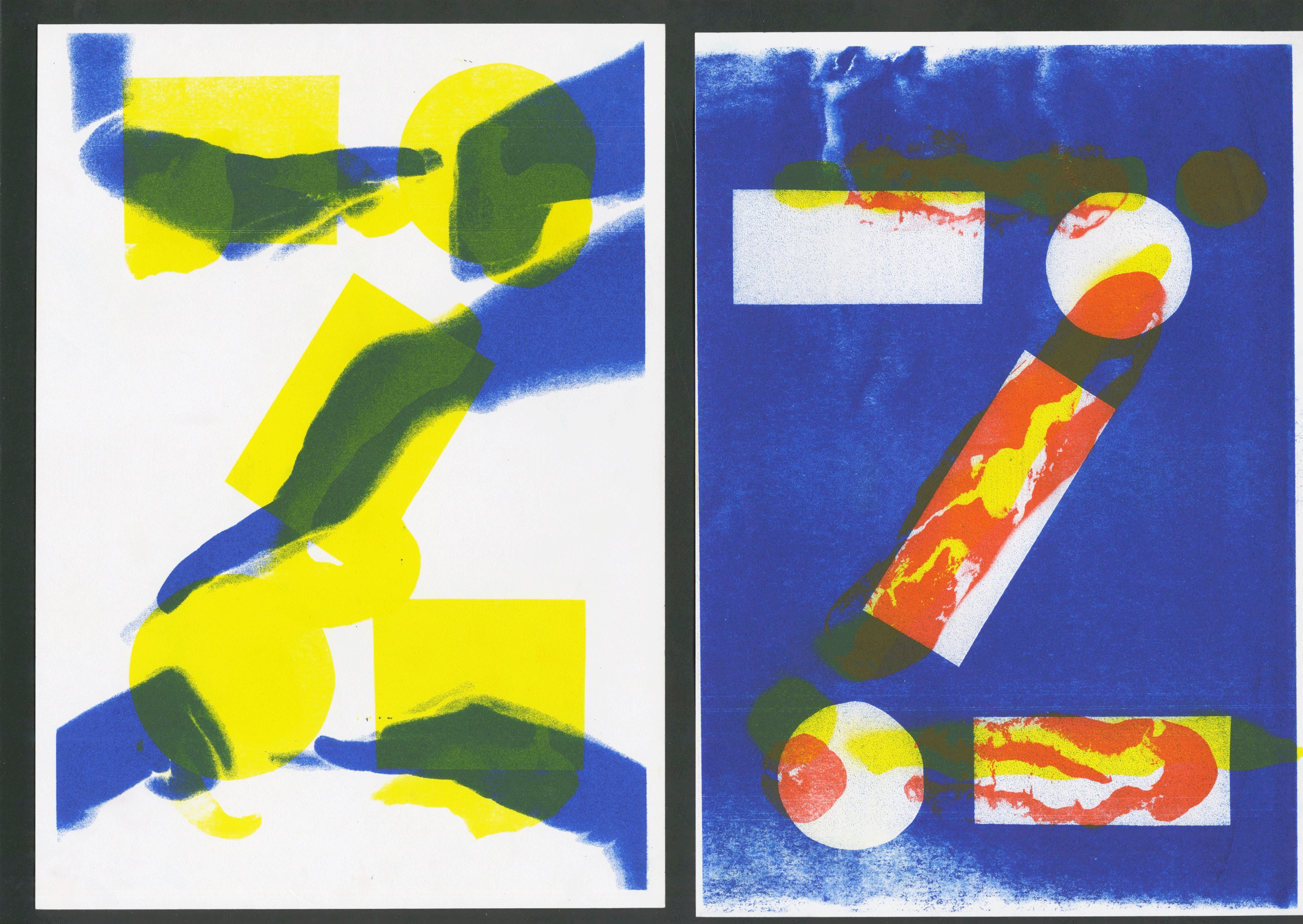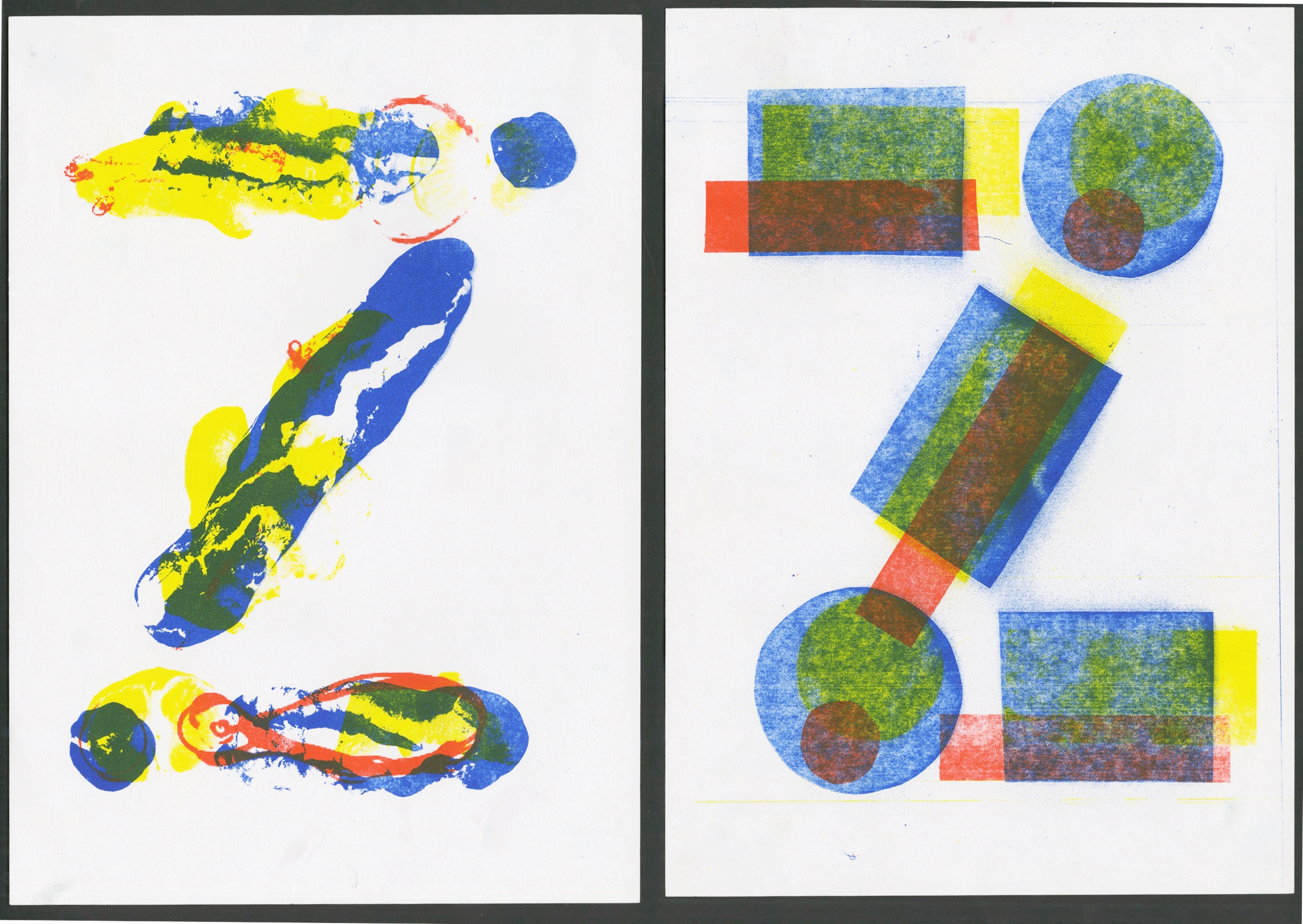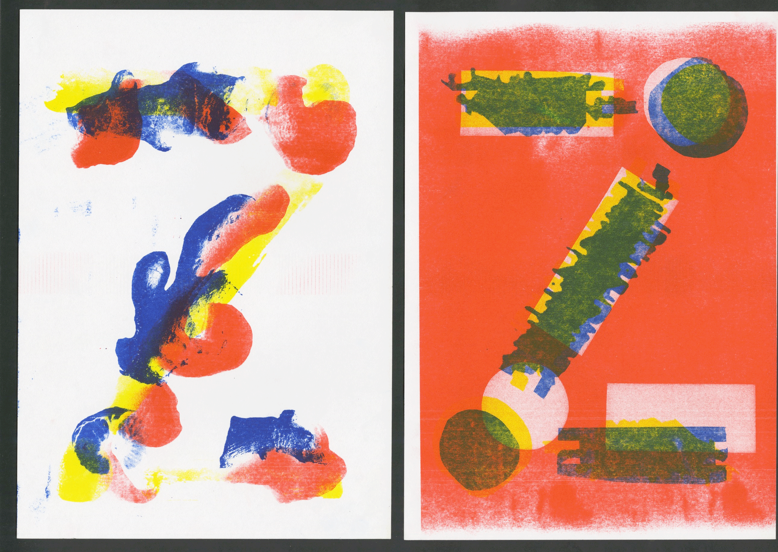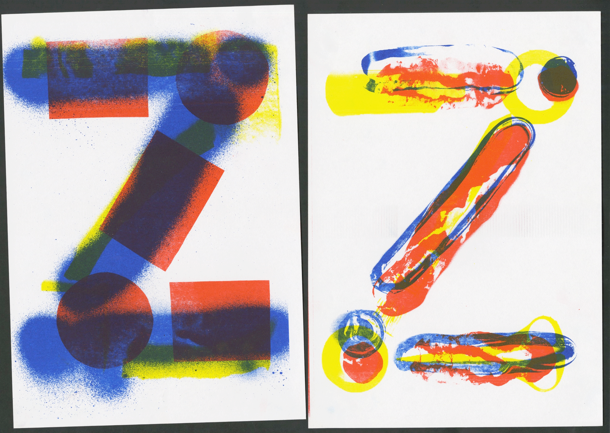 A type specimen of the letter Z, deriving from sketches in black ink. Within the ink sketches, layers became visible by the density of the black ink. But what happens when layers become visible by colour? Should each layer contain the same shape? What happens when you use different materialities such as paper, spray paint, clay, hands or textile?